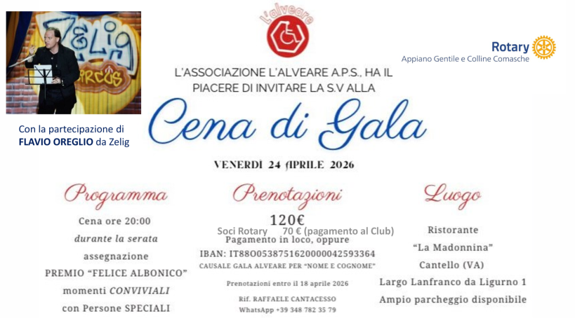 In occasione della consegna del Premio Felice Albonico, fondatore dell’ALVEARE, che quest’anno verrà assegnato al nostro Club, siamo lieti di invitarvi a una Cena di Gala che celebra valori, persone e condivisione.